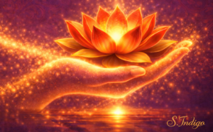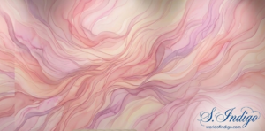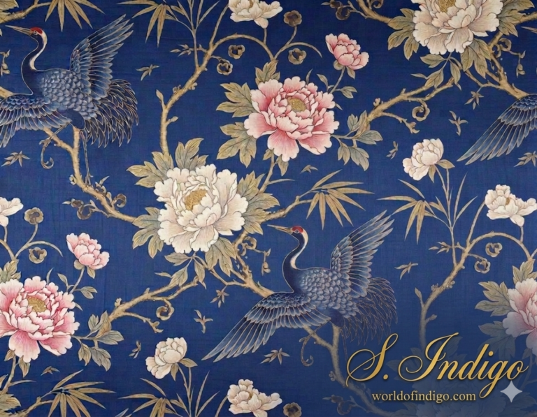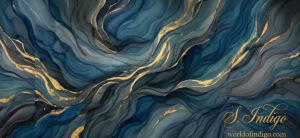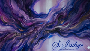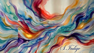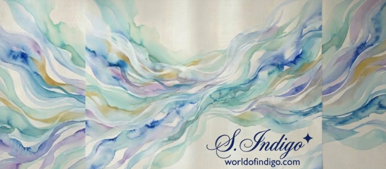 The S. Indigo Seal: At the heart of the desk, a solitary, antique wax-like indigo seal anchors the design. It is the signature of the creator, S. Indigo (seen only as a refined, back-facing silhouette with flowing, elegant curls). This is the source of the magic—where deep indigos are transformed into worlds of vibrant color.
