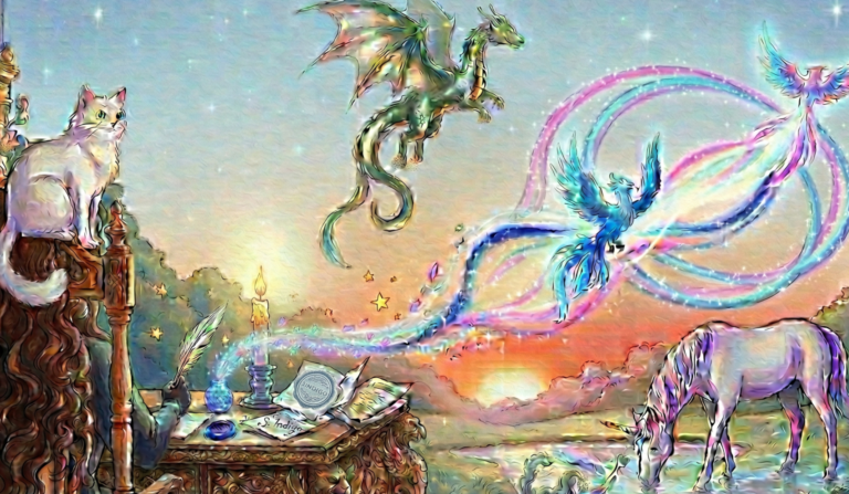 The Emerging Menagerie: As S. Indigo writes, the raw ink doesn’t just form patterns; it becomes life. A shimmering metallic green Dragon and a pair of radiant Phoenixes (with flight trails of white light, magenta, and sapphire blue) literally “leap out and off” the parchment, transforming before your eyes.